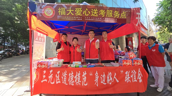 志愿者們?yōu)榕憧技议L(zhǎng)送上礦泉水 考場(chǎng)內(nèi),考生們?yōu)閴?mèng)想奮力拼搏??紙?chǎng)外,一場(chǎng)溫暖的護(hù)考行動(dòng)也在同步展開(kāi),為這場(chǎng)青春的征程增添了一份溫情與力量。 在泉州五中(城東校區(qū))考點(diǎn)前,泉州市東南公益協(xié)會(huì)聯(lián)合中國(guó)工商銀行泉州分行、中國(guó)平安人壽保險(xiǎn)股份有限公司泉州中心支公司、福建力誠(chéng)食品有限公司、泉州市急救指揮中心志愿者服務(wù)隊(duì)等多家單位和團(tuán)隊(duì),共同開(kāi)展“高考圓夢(mèng)志愿同行——豐澤區(qū)高考護(hù)考志愿服務(wù)”活動(dòng)。志愿者們精心布置服務(wù)點(diǎn),搭建起遮陽(yáng)棚,上面印著“旗開(kāi)得勝 馬到成功”的標(biāo)語(yǔ),桌上擺放著考試用品、清涼飲水、點(diǎn)心、應(yīng)急藥品等物資,全方位滿足考生和家長(zhǎng)的需求。 “阿姨,我可以幫忙嗎?”昨日7時(shí)許,泉州第九中學(xué)門口的福建省智善慈航公益服務(wù)中心志愿點(diǎn)前,11歲小姑娘洪語(yǔ)馨略帶緊張地跑過(guò)來(lái)咨詢能否參與志愿服務(wù)。原來(lái),她和爸媽一早從洛江區(qū)河市鎮(zhèn)來(lái)送哥哥進(jìn)考場(chǎng),臨別時(shí)洪語(yǔ)馨看著忙碌的志愿者們,突然提出想留下幫忙?!拔蚁肱愀绺缈荚?,也想幫考生們做點(diǎn)事!”小姑娘仰著臉十分期待,現(xiàn)場(chǎng)的志愿者與她的家人交流過(guò)后,熱情地交換了聯(lián)系方式,并為小姑娘登記了志愿時(shí)長(zhǎng)。