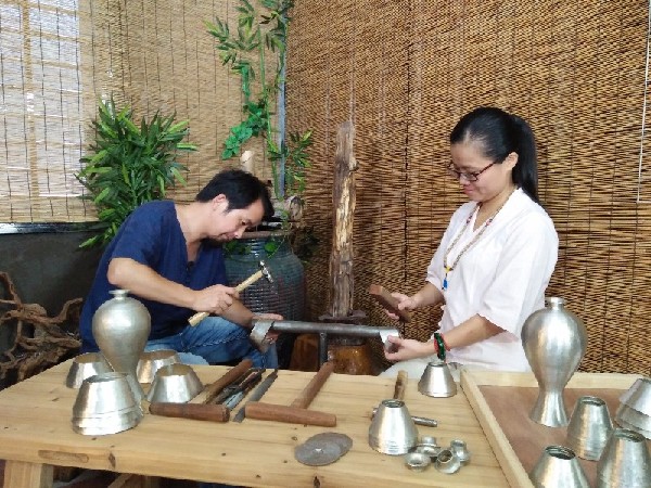 “我7歲就受泉州晉江民間打錫手藝人李耀輝一家的熏陶。”鄭天泗說,彼時(shí)大陸業(yè)界主要為臺(tái)灣代工制作宗教禮器、婚嫁用品,盡管樣式簡(jiǎn)單,仍讓他對(duì)錫雕產(chǎn)生了興趣。2000年從集美輕工業(yè)學(xué)校畢業(yè)后,他們夫婦二人便到李耀輝的第三代傳人李劍濘家中學(xué)習(xí)錫雕技藝,重續(xù)這項(xiàng)在同安斷層百余年的錫雕技藝。
