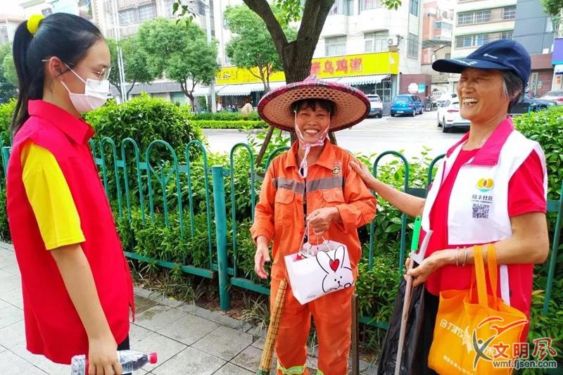 陸豐社區(qū)“安居樂業(yè)”版居民公約,助力文明創(chuàng)建。圖為陸豐社區(qū)的居民慰問環(huán)衛(wèi)工人。同安區(qū)委文明辦供圖