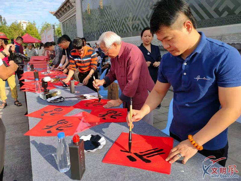 一邊是載歌載舞的舞臺表演,另一邊則是濃郁墨香的書畫助學現(xiàn)場。仁慈法師、林志良、葉曼林、羅鐘、嚴宗珍、曹原彰、黃文杰、黃亞彬、王玉麟、陳秀英、葉葆重等來自海峽兩岸的11位書法名家,揮毫潑墨,手寫勸學勵志楹聯(lián)或福字,為廣大市民送祝福。