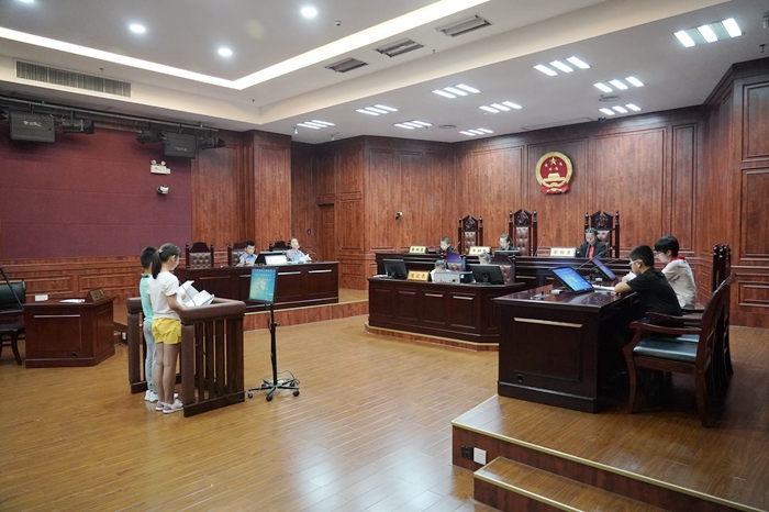 二、特色化服務(wù),開展“沉浸式”法治體驗(yàn)。廈門市中級(jí)人民法院充分結(jié)合司法機(jī)關(guān)和人民法官“維護(hù)公平正義”的職責(zé)使命,通過設(shè)計(jì)模擬法庭、觀看法治微電影、開展案例分析討論、法律知識(shí)有獎(jiǎng)問答等環(huán)節(jié)為小營員們提供內(nèi)容豐富、形式多樣的夏令營項(xiàng)目。其中,小朋友在模擬法庭中的扮演不同的角色,在志愿者的指導(dǎo)下全程參與刑事、民事、行政等各類不同案情案件的法庭庭審過程。該項(xiàng)目也成為小營員們參加度最高最受歡迎的項(xiàng)目。為配合未成年人保護(hù)法實(shí)施、強(qiáng)化小朋友們的自我保護(hù)理念,夏令營還安排法警介紹警隊(duì)警用器械的功能,并為小營員們手把手教授防身格斗的技巧,提升孩子們的自我防護(hù)基本技能。