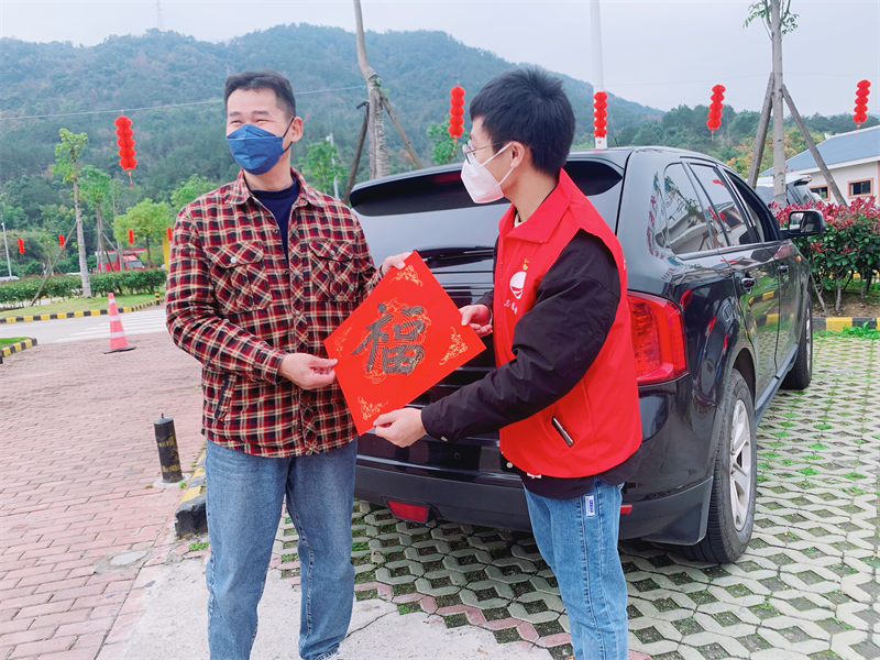 春節(jié)期間,海絲高速志愿服務(wù)隊(duì)員在高速服務(wù)區(qū)為車主送上春聯(lián)(省經(jīng)開公司供圖)