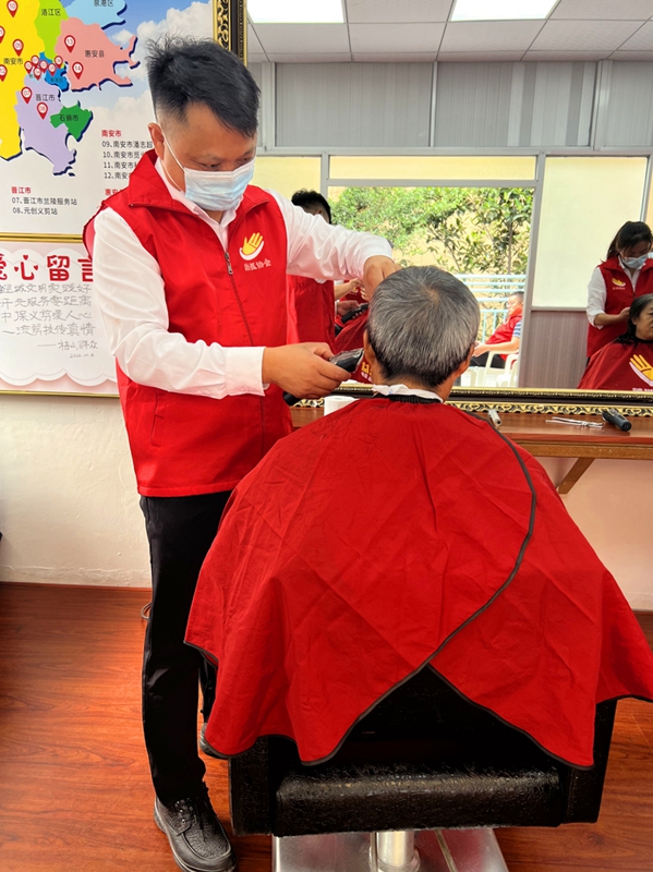 官文慶在泉州市開元街道實(shí)踐所為群眾義務(wù)剪發(fā)