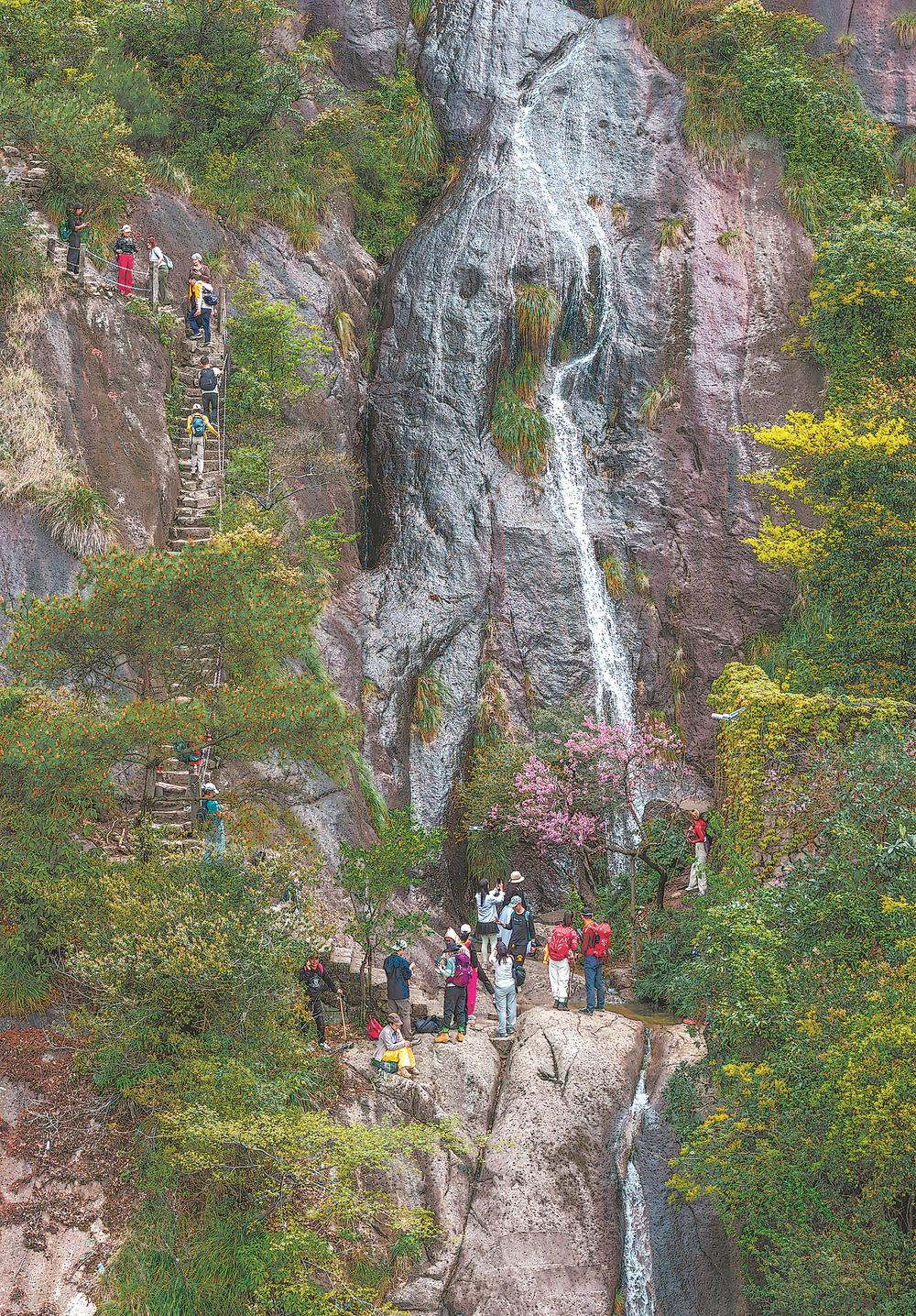 1日,福州鼓山白云洞,山澗旁的一株桃花吸引了登山市民駐足觀賞。葉民民 攝