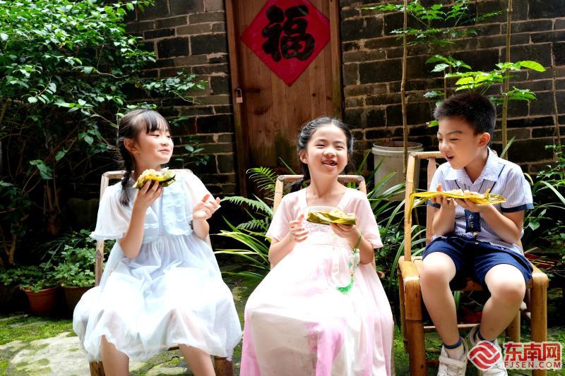 土樓娃品嘗美味的粽子笑開顏。 永定區(qū)融媒體供圖