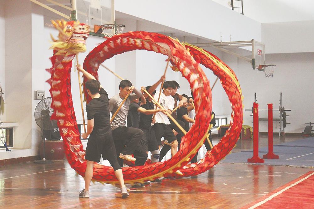 集美大學(xué)體育館內(nèi),舞龍隊隊員訓(xùn)練揮汗如雨。