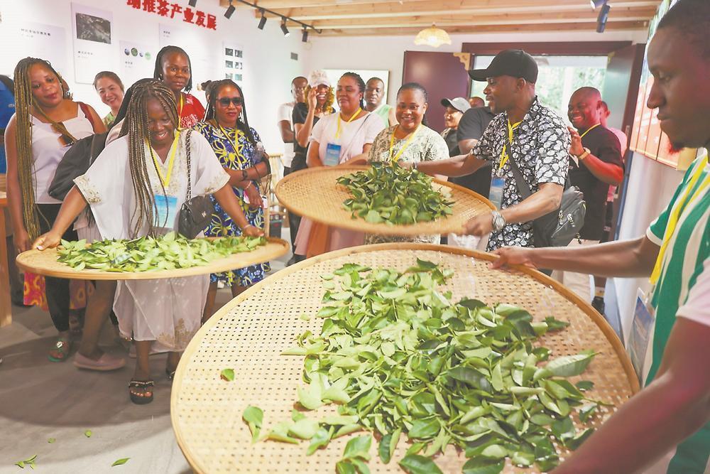 日前,赤道幾內(nèi)亞游客在武夷山體驗(yàn)武夷巖茶制作技藝中的手工搖青。邱汝泉 攝