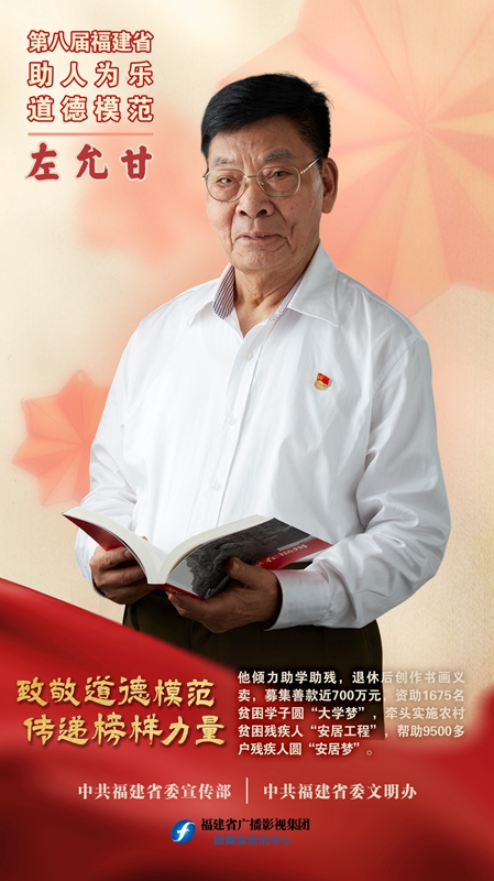 左允甘,1943年10月出生,福建省紀(jì)委原副書記。2008年12月退休后,他傾力助學(xué)助殘,創(chuàng)作書畫進行義賣,募集善款近700萬元,資助1600多名貧困學(xué)子圓“大學(xué)夢”,幫助20多名特困學(xué)子解決家庭困難,牽頭實施農(nóng)村貧困殘疾人“安居工程”,幫助9500多戶農(nóng)村貧困殘疾人家庭圓“安居夢”。[詳細(xì)]