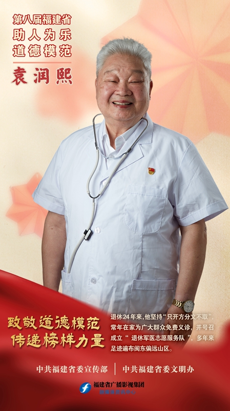 袁潤熙,1944年7月出生,寧德軍分區(qū)衛(wèi)生所原所長、大校軍銜。退休24年來,他堅持“只開方分文不取”,常年在家為廣大群眾免費義診,每天少則二三十人,多則五六十人。他還號召軍休醫(yī)護人員成立“退休軍醫(yī)志愿服務(wù)隊”,多年來足跡遍布閩東偏遠(yuǎn)山區(qū)。[詳細(xì)]