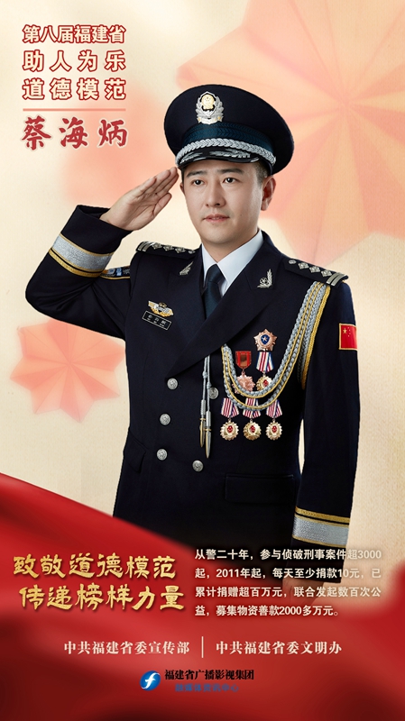 蔡海炳,1976年11月出生,泉州市石獅市公安局錦尚派出所所長、一級警長。從警20多年來,他參與偵破3000多起刑事案件,是省公安廳首批情報研判專家。2011年以來他每天至少捐款10元,已捐善款達(dá)百萬元,個人微博粉絲200多萬,聯(lián)合發(fā)起百次公益,帶動2萬多人參與助弱救殘,募集物資善款超2000萬元。[詳細(xì)]
