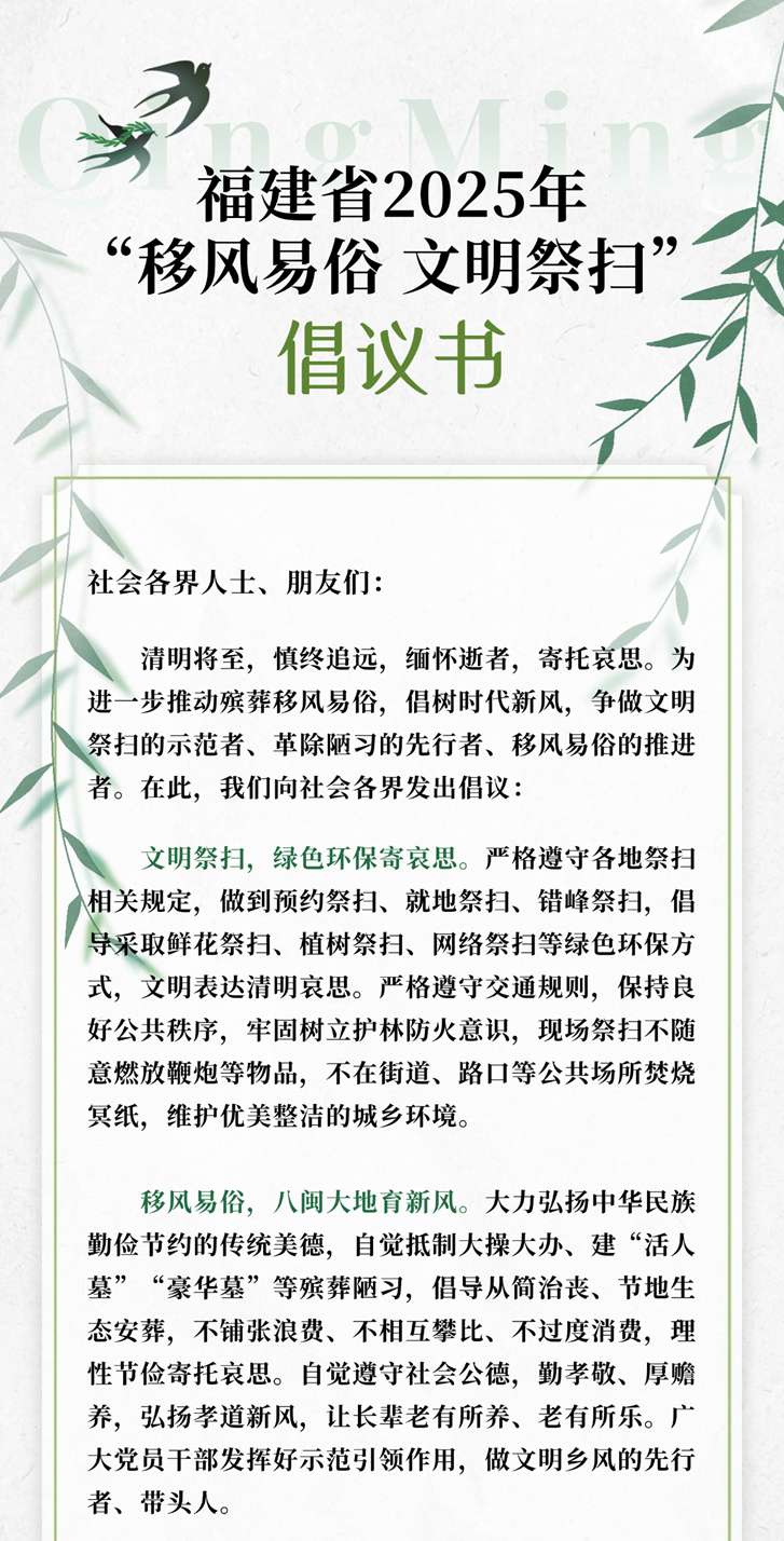 清明將至,慎終追遠(yuǎn),緬懷逝者,寄托哀思。為進(jìn)一步推動殯葬移風(fēng)易俗,倡樹時代新風(fēng),爭做文明祭掃的示范者、革除陋習(xí)的先行者、移風(fēng)易俗的推進(jìn)者。[詳細(xì)]
