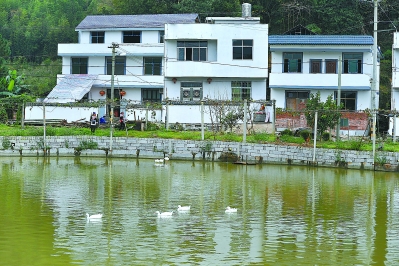 福湖村在青山環(huán)抱間,一座座烏瓦白墻的畬家民居錯(cuò)落有致。