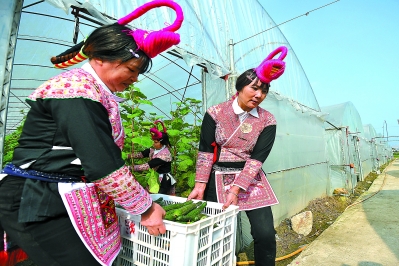 在竹里村一家農(nóng)業(yè)合作社內(nèi),村民正采摘新品黃瓜。